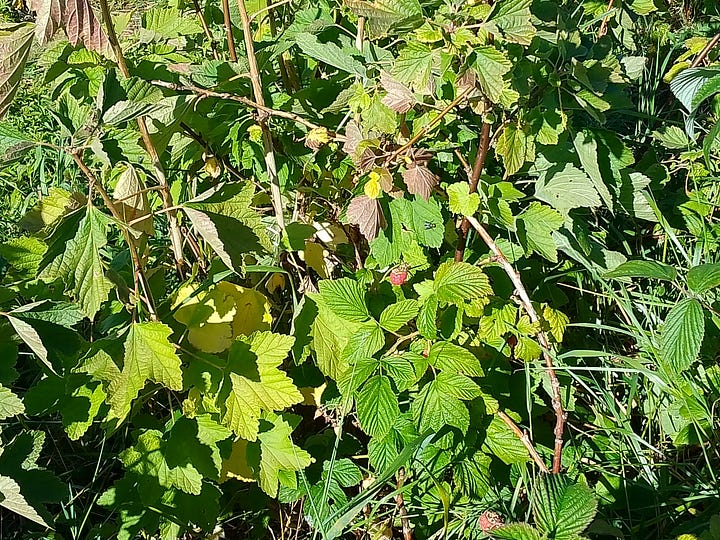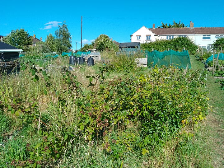 My new plot has been abandoned for some time, but I feel it holds promise. There is a straggly blackberry and raspberry bush and even a few ripe raspberries that I think are being plucked by the neighbours. Which is fine – they can race the bugs for them.